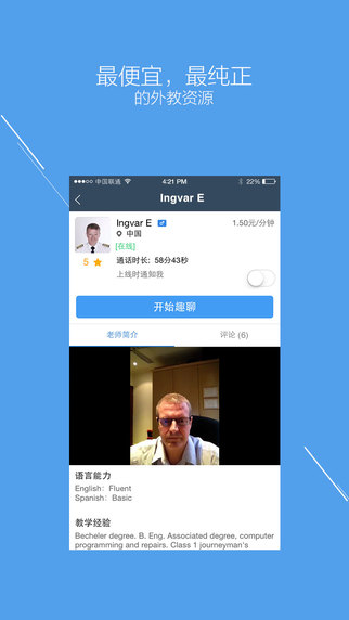 你可能有很多口語學(xué)習(xí)資料或軟件,你可能覺得自己朗讀起英語來已經(jīng)是播音級了,然而這一切只是紙上談兵。老外趣聊是國內(nèi)首款實(shí)現(xiàn)真人外教一對一視頻交流的英語口語學(xué)習(xí)軟件。它打破傳統(tǒng)語言學(xué)習(xí)方式,讓英語交流變得更專業(yè),更有趣。