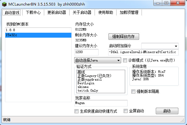 1、運(yùn)行根目錄下的【MCLauncherBN.exe】啟動器后,選擇想要啟動的版本進(jìn)行游戲,1.8.8是最新的正式版,中文版。15w32c是最新的1.9快照版,能夠提前玩到1.9的內(nèi)容。啟動器會自動檢測機(jī)器是否有java并提示下載。點(diǎn)擊【啟動】可以啟動選中的版本。