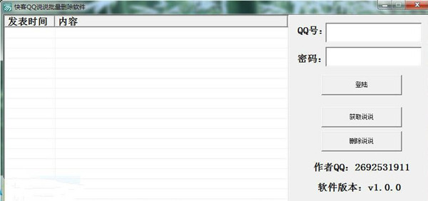 快客QQ說說批量刪除軟件 1.0.0 綠色版 快客QQ說說批量刪除軟件是一款2015最新的QQ說說批量刪除工具,它可以幫助你快速批量刪除QQ空間里的說說,免除一條一條刪除的煩惱,登陸QQ號獲取說說列表,然后進(jìn)行批量刪除的空間輔助工具,為你節(jié)省時間,提高效率。