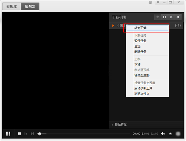4、選擇一個(gè)資源點(diǎn)擊觀看,進(jìn)入觀看界面后等待廣告播放完畢,然后右鍵播放列表的電影名選擇轉(zhuǎn)為下載該電影就進(jìn)入下載狀態(tài)了。