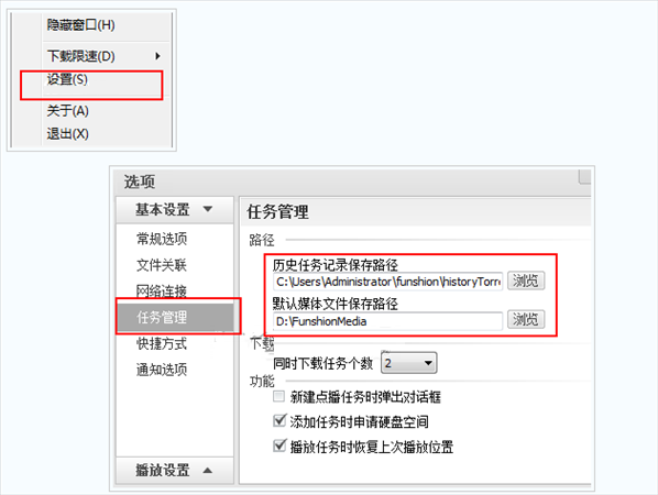 5、關(guān)于下載的默認(rèn)路徑可以通過(guò)右鍵托盤圖標(biāo)選擇設(shè)置,點(diǎn)擊任務(wù)管理進(jìn)行下載的相關(guān)設(shè)置。