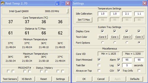 Real Temp V3.7.0 綠色免費版下載 Real Temp是一款專為Intel處理器開發(fā)的溫度檢測工具,支持各種單核心、雙核心、四核心型號。它根據(jù)每個核心內(nèi)集成的數(shù)字熱敏傳感器(DTS)報告其溫度,并同時給出和最高允許溫度(TjMax)的距離,提醒你注意保持清涼。與其他許多的傳感器不同,它可以同樣地工作于筆記型和桌面型電腦。Real Temp 不需安裝,只需要解壓到文件夾中或者外部磁盤,然后直接運行即可。