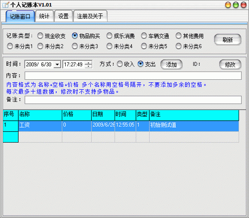 本軟件用于個人記賬,軟件小巧,綠色無需安裝,可以放在U盤中隨身攜帶。