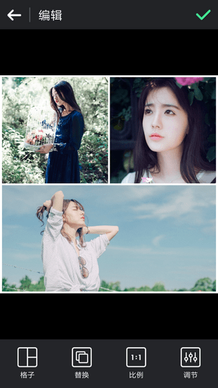 滑動可調(diào)整格子模板樣式,點(diǎn)中拖動圖片即可交換圖片,捏拉可以縮放。