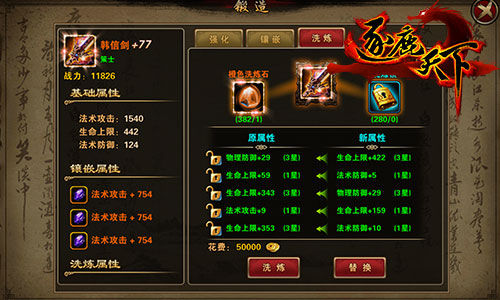 值得洗煉的主要是橙色、紫色裝備。橙色裝備有5條可洗煉屬性,紫色也有4條,屬性增加有高有低(星級越高增加越多),而屬性種類可以一致(比如5條全是物攻)。是極端堆砌,還是劍走偏鋒,都由你決定,若是洗出了心儀的高額屬性,別忘了使用洗煉鎖喔。
