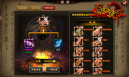 “神器”是《逐鹿天下》的創(chuàng)舉,每一件橙色武器上除了普通屬性之外,還會附加額外的“神器屬性”和“神器技能”兩個條目。當然,你可以將它裝備在別的武將身上,依然享有裝備等級、鑲嵌寶石和洗煉屬性;但如果你有神器指定的武將,給他裝備上,即可為該武將額外增加巨額的神器屬性,以及被動神器技能。橙武的獲取條件十分苛刻,與其他部位的裝備一樣需要用低品質裝備或武器慢慢合成,而且還需要消耗神器碎片。雖然工程浩大,但是為了稱霸天下,又有何懼?