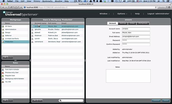你的用戶權(quán)限控制你可以對每個(gè)工作組中的字體進(jìn)行的操作,包括是否擬可以添加字體,共享字體集,改變一個(gè)字體的類。