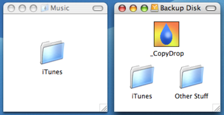 CopyDrop for Mac的概念,使之可以使用Finder中拖放文件夾,卷和文件。這意味著相同的物品已在目標(biāo)不會(huì)重新復(fù)制,節(jié)省時(shí)間。有兩種模式,“取代”和“合并”。在“替換”模式,只存在于該目標(biāo)的任何項(xiàng)目將被去除,使得其結(jié)果將是一個(gè)目的地相同的來(lái)源。在“合并”模式,在目標(biāo)的唯一項(xiàng)目是原封不動(dòng)使得目的地包含以前有(而不是在源中)的所有文件加在源中的每一個(gè)文件。