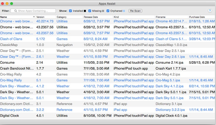 Apps Assist for Mac啟動(dòng)后將掃描你的iTunes資料庫(kù),并列出有關(guān)那些被安裝了,失蹤的(在iTunes變灰的通用應(yīng)用程序圖標(biāo)),或不再安裝,只是占用空間的移動(dòng)應(yīng)用程序文件夾中的iOS應(yīng)用程序和信息。使用這個(gè)列表,你可以管理你的應(yīng)用程序和移動(dòng)應(yīng)用程序更加簡(jiǎn)單。