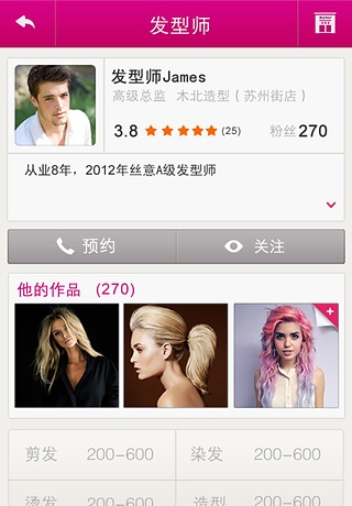 提供詳細(xì)的發(fā)型師個人資料,包括從業(yè)時間、個人特長、價位、客人的評價等,讓你心中有數(shù)。