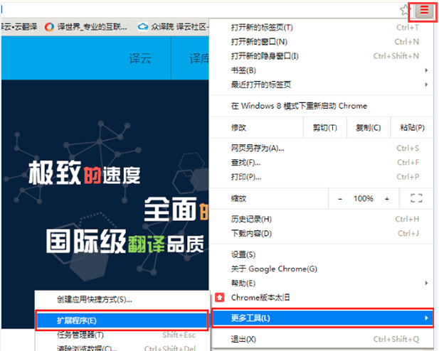 1、下載解壓后,得到 crx 插件安裝包,打開(kāi)瀏覽器的擴(kuò)展管理頁(yè)面:點(diǎn)擊瀏覽器右上角的設(shè)置圖標(biāo)—>選中“工具”或“更多工具”—>選中“擴(kuò)展程序”: