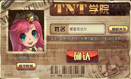 1、建立角色需要設(shè)置您的游戲昵稱,并選擇角色性別(姓名可為中英文或數(shù)字,長度不超過16個字符),輸入后系統(tǒng)自動檢測昵稱是否可用。如果實在想不出要叫什么昵稱,TNT還很貼心的為你準備了【隨機名字】按鈕,輕輕一點擊,就不用為昵稱煩惱了, 填寫完畢后,點擊【進入游戲】按鈕,就可以進入游戲。