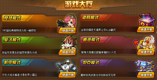 1.游戲中有6個模式,競技模式、復活模式、道具模式、邂逅模式、機甲模式、坦克模式。新玩家只能從競技模式玩起,其他模式均有等級要求,詳細介紹可見其他模式的玩法詳解。