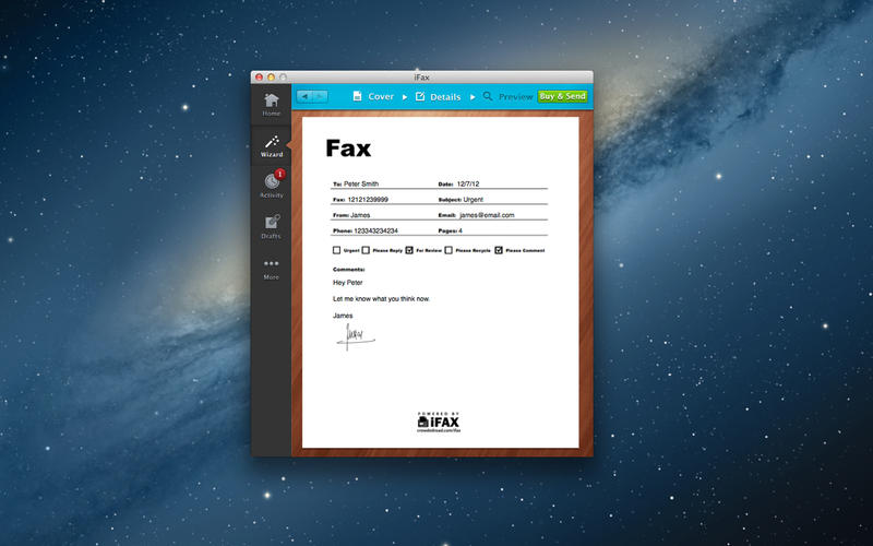 iFax for Mac是一個快速而簡單的向?qū)?。只有幾個接口可以創(chuàng)建和發(fā)送一個定制的傳真至任何地方,隨時隨地。隨附你的標志和簽名。將你的公司標志傳真封面,然后添加數(shù)字簽名尋找個人聯(lián)系。提供封面模板。選擇各種主題的封面上包括經(jīng)典,現(xiàn)代城市,時髦的,休閑的風格。封面頁是可選的。傳入傳真技術(shù)。選擇一個本地或免費傳真號碼在世界任何地方。