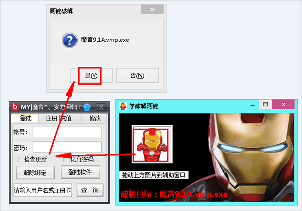 將補丁中的鋼鐵俠小按鈕拖拽到輔助中即可破解
