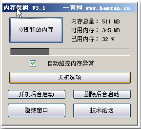 內(nèi)存保姆(內(nèi)存優(yōu)化工具) V3.1免費(fèi)下載 小巧的優(yōu)化內(nèi)存工具內(nèi)存保姆是一個(gè)小巧的優(yōu)化內(nèi)存,非常有效高速的釋放內(nèi)存,防止系統(tǒng)沖突..該軟件可以設(shè)置開機(jī)自動(dòng)運(yùn)行、自動(dòng)監(jiān)控內(nèi)存異常、開機(jī)自動(dòng)最小為托盤狀態(tài),而且還有定時(shí)關(guān)機(jī)、重啟、注銷功能哦,推薦給大家!