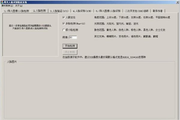 陽光人臉識別驗證系統(tǒng)僅限用于可見光(如室內(nèi)光,日光燈,節(jié)能燈,白熾燈),并要求用戶主動配合采模板,主動配合識別.最好有USB攝像頭