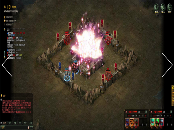 6、右上角的大勢圖,顯示了當前游戲中各個城市的歸屬情況,其中漢朝的城市顯示為紅色,黃巾的城市顯示為紫色,魏國的城市顯示為青色,蜀國的城市顯示為黃色,吳國的城市顯示為綠色。點擊大勢圖右下的按鈕,可以在行營/大地圖場景之間進行切換。