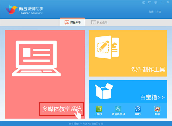 打開軟件后,點(diǎn)擊 “暢言多媒體教學(xué)系統(tǒng)”,即可進(jìn)行電子課本和資源結(jié)合的課堂教學(xué)。