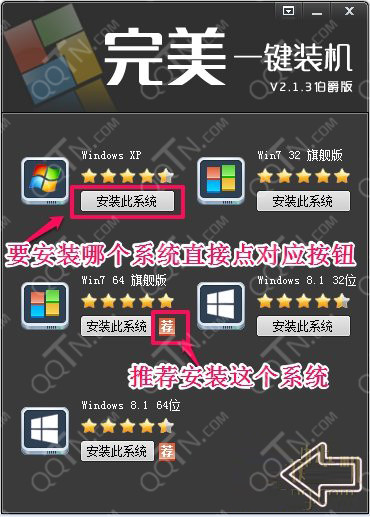 這里會出現(xiàn)一個(gè)“薦”字,這個(gè)就是完美一鍵裝機(jī)軟件自動檢測出您這臺機(jī)子的硬件配置然后通過配置推薦您裝什么系統(tǒng)最好,當(dāng)然這只是一個(gè)參考,您也大可以裝其它系統(tǒng)。但是如果出現(xiàn)一個(gè)“?!弊值脑?,最好別裝這個(gè)系統(tǒng),裝的話極大可能會導(dǎo)致安裝的過程中會出現(xiàn)藍(lán)屏等,不確定的因素。(提示:鼠標(biāo)移動到“薦”字或者“?!弊志蜁霈F(xiàn)本機(jī)系統(tǒng)的配置信息。)選擇您想要裝的系統(tǒng),然后直接點(diǎn)擊安裝此系統(tǒng)接下來完美一鍵裝機(jī)軟件,就會下載這個(gè)系統(tǒng)。