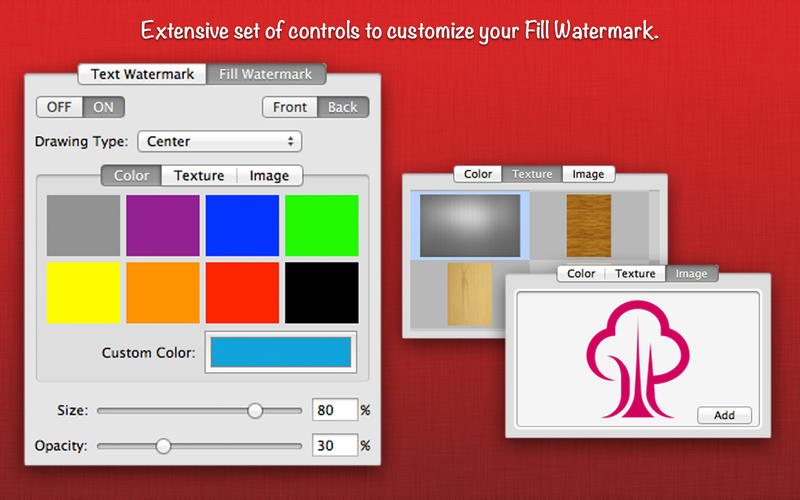 選擇顏色自定義填充水印,紋理或自定義圖像集合的大小,不透明度和拉式(單,中心,適合頁面,拉伸以填充頁面,交叉,瓦)。