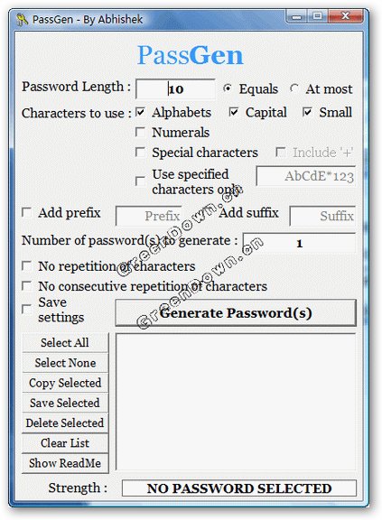 PassGen 1.31 英文綠色免費(fèi)版 PassGen 可以按照用戶的需要產(chǎn)生字母、數(shù)字或字母與數(shù)字混合型密碼。字母可以是小寫、大寫或大小寫混合,自動生成。使用非常方便。其窗口很緊湊并且可以設(shè)置成“總在上面”以便隨時(shí)可以看到