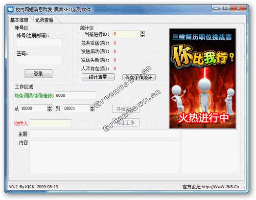 校內(nèi)網(wǎng)短消息群發(fā) V0.2 簡體中文綠色免費版 校內(nèi)網(wǎng)短消息群發(fā)V0.2 *各項配置支持自動記憶; *指定ID號段進行群發(fā); *支持統(tǒng)計保存、讀?。?nbsp;操作說明:間隔時間建議6000毫秒(6秒);工作區(qū)域段可從1-幾億,工作時會自動讀取收件人姓名,如果無收件人將自動跳過執(zhí)行下一位