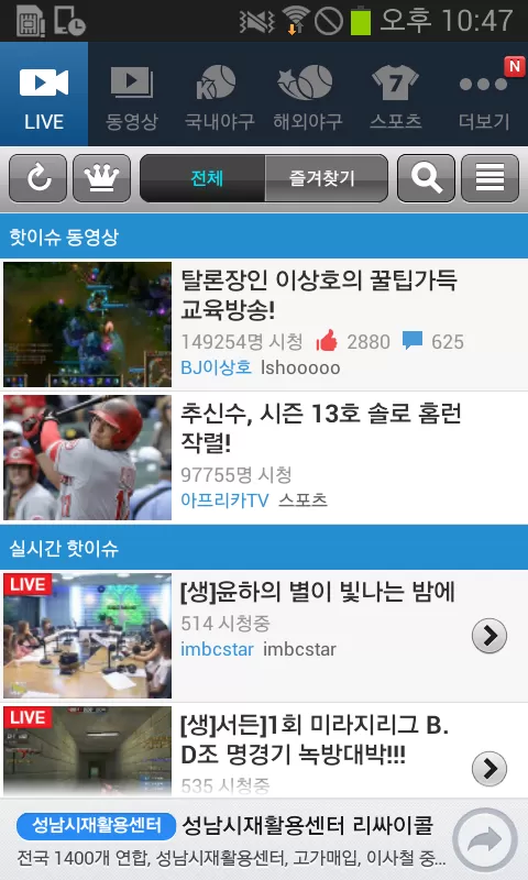 Afreeca電視,體育賽事,游戲節(jié)目,談話節(jié)目等具有多種地面和有線廣播實時功能