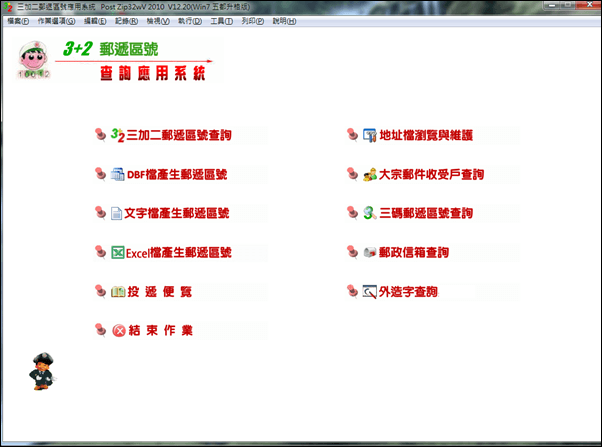 2. DBF 檔產(chǎn)生郵遞區(qū)號(hào):讀取事先備妥之地址檔(.DBF 檔),產(chǎn)生各地址3+2 郵遞區(qū)號(hào),并可列印選取資料之報(bào)表及標(biāo)簽,供黏貼于信封上。