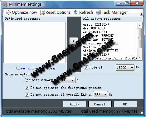 Minimem V1.30 英文綠色免費(fèi)版 Minimem是一種很實(shí)用的工具,它可以減少應(yīng)用程序運(yùn)行時(shí)所需的內(nèi)存,在后臺(tái)運(yùn)行時(shí),它周期性地( 默認(rèn)情況下30秒)將內(nèi)存的使用降到最小。它的功能主要是靠將內(nèi)存的內(nèi)容存儲(chǔ)到硬盤的交換文件或頁面文件上,暫時(shí)為其他程序的運(yùn)行提供內(nèi)存空間來實(shí)現(xiàn)的。這對(duì)那些使用舊PC或較小內(nèi)存的用戶幫助很大.