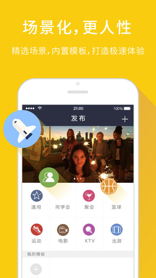 預(yù)設(shè)同學(xué)會、聚餐、跑步、K歌、出游等場景,個性化模板定制,保存常用活動,避免重復(fù)編輯,打造場景時代移動端入口,體驗極速發(fā)布。