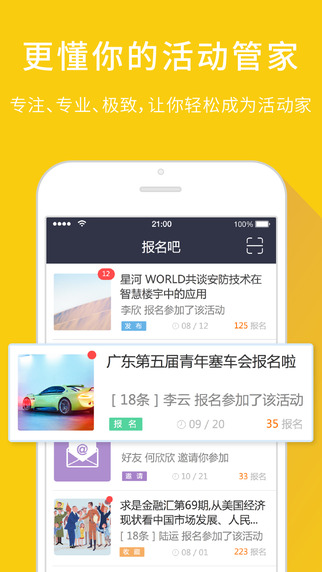 報名吧app是一款基于活動的O2O社交工具,報名吧是最好的活動發(fā)布和管理工具,是場景時代最佳移動端入口之一??稍?秒內(nèi)完成一場活動的發(fā)布,是目前全球最快的移動端活動發(fā)布工具。