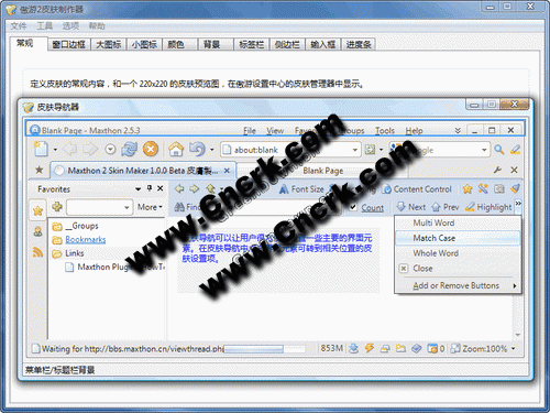 傲游2 [Maxthon] 皮膚制作器。皮膚制作器并非插件,而是獨(dú)立運(yùn)行的小程序,但不需要安裝,解壓后雙擊 SkinMaker.exe 便能運(yùn)行。皮膚制作器內(nèi)置 皮膚導(dǎo)航 及 圖案切割 2 個(gè)工具,皮膚導(dǎo)航是幫助用戶快速找到一些主要介面元素的皮膚制定項(xiàng)目,而圖案切割則是方面 port 皮膚