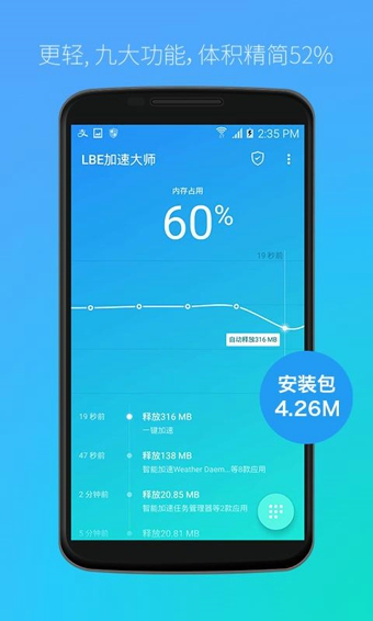 LBE加速大師是LBE推出的全新產(chǎn)品,這款軟件功能強大實用,可以幫手機提速60%,最高可延長一倍的續(xù)航時長,而且軟件內(nèi)存占用非常小,真正幫手機進(jìn)行“瘦身”計劃,讓手機丟開“包袱”運行如飛。