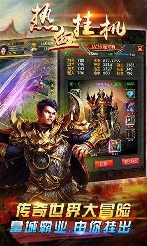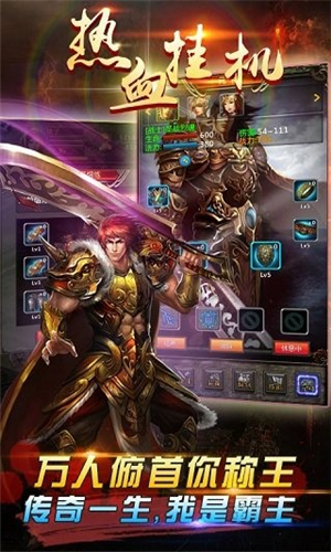 絢麗的游戲界面,為你打造完美魔幻世界!戰(zhàn)、法、道,三大職業(yè)任你選!多變的PK技能、豐富的玩法和剌激的副本BOSS等你來(lái)體驗(yàn)!快下載《熱血掛機(jī)HD》締造巔峰傳說(shuō),打造不朽傳奇吧!玩法和剌激的副本BOSS為一體?!皯?zhàn)士,道士,法師”三大職業(yè),行會(huì)戰(zhàn),華麗特效滿(mǎn)屏呈現(xiàn),讓我們一同締造巔峰傳說(shuō),打造不朽的傳奇!