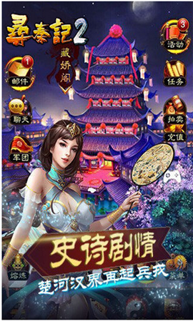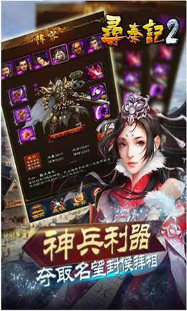 《尋秦記2》是一款講述秦朝末年戰(zhàn)爭的回合制策略卡牌游戲。多樣的技能,酷炫的招式,配合近百個武將獨有的成長和戰(zhàn)斗天賦,玩出萬種搭配。首創(chuàng)美人上陣系統(tǒng),數(shù)十位如虞姬一樣名滿天下的美人與君共行!多元的英雄培養(yǎng),龐大的裝備系統(tǒng),拍賣行、漢宮秘寶、競技場兌換、皇陵探寶多種福利活動助君進階武將,升級裝備!還有競技場、捍衛(wèi)北疆、掠奪等豐富多樣的PVP與奪寶玩法。讓我們與項羽攜手共進,爭霸中原吧!!