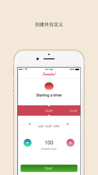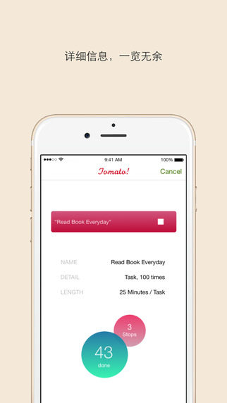 想要更好地管理您的時間、細(xì)化每天的任務(wù)并停止半途而廢嗎?有了Tomato!,您的iPhone就變成了一個高效的時間管理器,并能助您在一天之中完成更多。創(chuàng)建一個計時器易如反掌。您可以選擇各樣的預(yù)設(shè)時間并且定制你想完成一個任務(wù)的次數(shù)。然后,您所建立的任務(wù)將會顯示在主頁中。在主頁里,您可以開始、打斷、恢復(fù)、標(biāo)記完成、刪除或查看一個任務(wù)的詳情。若您所標(biāo)記完成的任務(wù)沒有在7天內(nèi)恢復(fù),將會自動刪除。