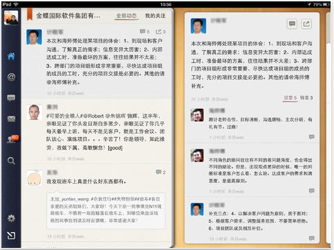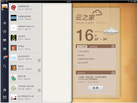 云之家是一個強(qiáng)大的企業(yè)社交平臺,已榮獲CCID最具價值互聯(lián)網(wǎng)企業(yè)級產(chǎn)品獎。不分行業(yè),面向所有企業(yè)員工,操作簡單,用戶就像在使用新浪微博一樣。除了提供私密、安全的社交平臺以外,云之家更關(guān)注企業(yè)的團(tuán)隊(duì)協(xié)作效率、文檔分享和知識交流。云之家 for iPad 是專為iPad平板電腦用戶設(shè)計(jì)的云之家客戶端,精心設(shè)計(jì)的操作界面、新穎流暢的交互體驗(yàn),讓你以全新的方式隨時隨地使用云之家服務(wù)。讓你可以隨時隨地使用云之家的服務(wù),在工作中隨時隨地溝通、協(xié)作、分享。