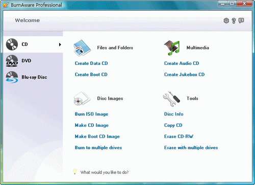BurnAware的界面清晰簡單,功能分類一目了然。它支持我們最常用的CD光盤、DVD光盤的刻錄以及最新的藍光光盤(Blu-ray Disc)的刻錄,實在是相當實用。【軟件特點】