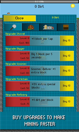 掘地公司是一款有著像素風(fēng)格的休閑游戲。游戲主要是挖掘各種礦物質(zhì),同時(shí)你可以調(diào)整挖掘時(shí)間,本作是個(gè)點(diǎn)點(diǎn)點(diǎn)的游戲,萬(wàn)事開(kāi)頭難,攢夠提升單次挖掘數(shù)后,游戲才算真正開(kāi)始,一旦開(kāi)啟實(shí)驗(yàn)室里的離線挖掘后就可以用調(diào)時(shí)間大法。【游戲特色】