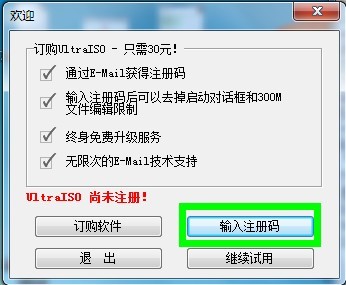 因為UltraISO軟件尚未注冊,所以這時會出現(xiàn)了要求激活的界面,請點擊右下角的“輸入注冊碼”