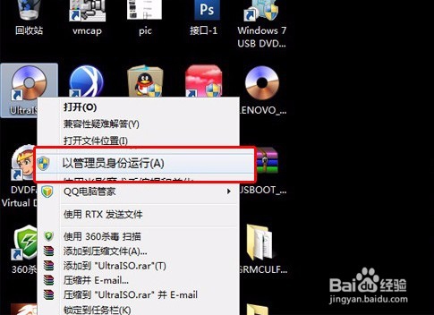 在安裝完成UltraISO之后,一定要右鍵,選擇以管理員身份運行,如果直接雙擊有可能造成無法成功寫入
