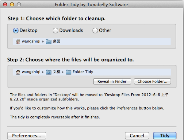 Folder Tidy for mac是一款幫助用戶整理自己桌面文件夾的Mac軟件,用戶只需要選擇需要清理的文件夾,眨眼功夫,所有的文件就會(huì)按照類別(照片、音樂、文檔等等)分別整理好,并得到一個(gè)名為“x月x日x時(shí)的桌面”這樣的目錄。軟件默認(rèn)設(shè)定了12種分類規(guī)則,你也可以自定義自己的規(guī)則,讓軟件分的更細(xì)、更符合你的使用習(xí)慣。