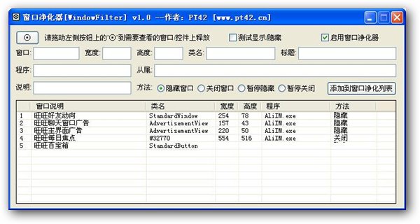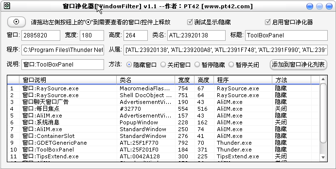 窗口凈化器(WindowFilter) 是一款窗口/控件過濾工具,可以有效的屏蔽系統(tǒng)內各種軟件窗口/控件。