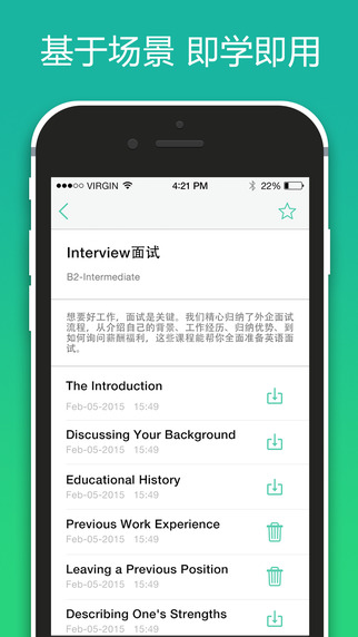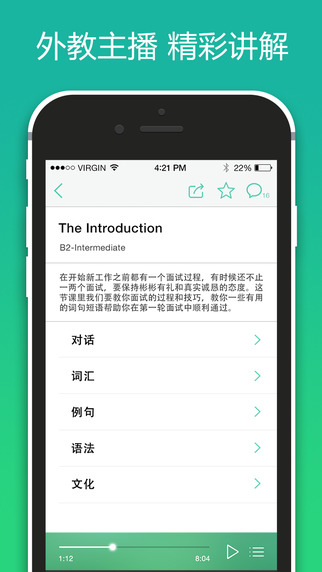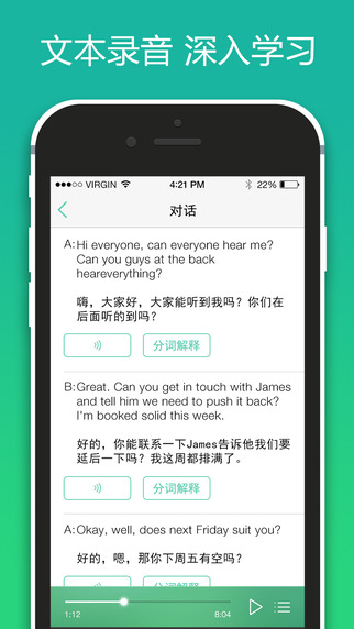 碎片化學(xué)習(xí)、超實(shí)用的課程主題、精彩到位的老師講解、個(gè)性化學(xué)習(xí)工具,輕松用app或網(wǎng)站就可以學(xué)到最地道的口語(yǔ)!教你最實(shí)用的語(yǔ)言。每個(gè)課程都帶給你你最新最I(lǐng)N的課程對(duì)話,讓你學(xué)了還想學(xué)。上百節(jié)課程內(nèi)容都發(fā)生在真實(shí)的生活場(chǎng)景中,讓你身臨其境地學(xué)習(xí)語(yǔ)言。復(fù)習(xí)課程對(duì)話、關(guān)鍵詞匯和語(yǔ)法點(diǎn)來(lái)鞏固你學(xué)習(xí)到的知識(shí)。用擴(kuò)展例句功能幫你加深印象,用發(fā)音糾正工具來(lái)提高你的口語(yǔ)能力。完成課后練習(xí),就可以測(cè)試你掌握課程知識(shí)的能力了。生詞卡工具可以幫你更好的記憶新生詞。