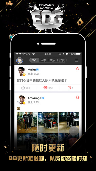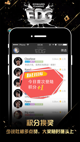 這是一款Edward Gaming 電子競(jìng)技俱樂(lè)部官方社交應(yīng)用。在這里,用戶可以與EDG俱樂(lè)部的隊(duì)員親密接觸,實(shí)時(shí)了解戰(zhàn)隊(duì)動(dòng)態(tài),參與官網(wǎng)活動(dòng),并與附近的玩家互動(dòng)。【edg俱樂(lè)部軟件特色】