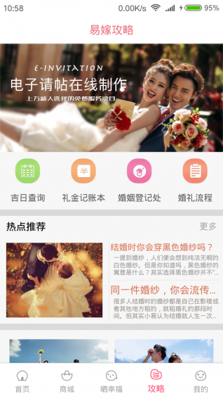 幸福易嫁是一款便捷的掌上購物應(yīng)用。該應(yīng)用是專為各大即將步入婚姻殿堂的新人們所準備的購物平臺,婚禮中的一切物品皆可在幸福易嫁APP平臺上購買,用最優(yōu)的性價比購入。