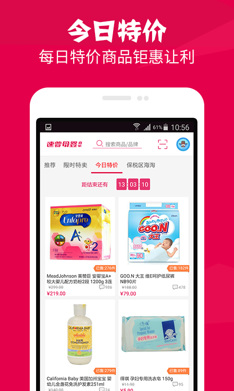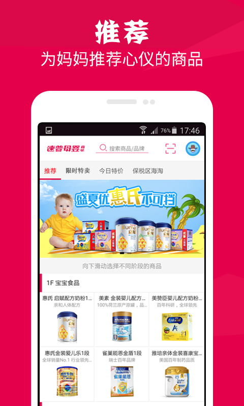 速普母嬰商城,國內(nèi)知名母嬰電商企業(yè),提供保稅區(qū)海淘、海外直郵、商城、特賣服務(wù)的母嬰購物網(wǎng)站,主營孕婦用品、奶粉、尿褲濕巾、營養(yǎng)輔食、喂養(yǎng)洗護(hù)、車床寢具、玩具圖書、嬰兒服飾、美食及美妝日用十二大類,涵蓋國內(nèi)外近千個知名品牌,逾萬種單品。—中國首批出具電子發(fā)票的電商平臺;