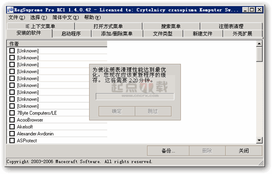 一個(gè)可以用來清除 Windows 注冊表文件的工具。這個(gè)工具的好處是,當(dāng)你執(zhí)行這個(gè)工具后,會將 Windows 注冊表文件的注冊表資料以詳細(xì)的清單顯示,包括:軟件名稱、出版公司、很多無用的軟件注冊表資料等等。你可以透過詳細(xì)的清單顯示利用 RegCleaner 來清除這些無用的注冊表資料。提供方便的清除方式,只需在要刪除的注冊表資料內(nèi)打勾,即可一次幫你自動清除。當(dāng)你清除這些無用的注冊表資料后,你可以使用其它的注冊表文件重整工具來重整注冊表文件,可以使你的 Windows 注冊表文件大大的減肥,進(jìn)而讓系統(tǒng)執(zhí)行的更順暢。