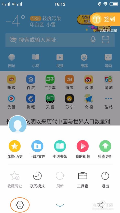 然后在彈出來的窗口中找到一個齒輪形狀圖形,如圖箭頭所指示位置,點擊該圖形,進入瀏覽器設(shè)置頁面。